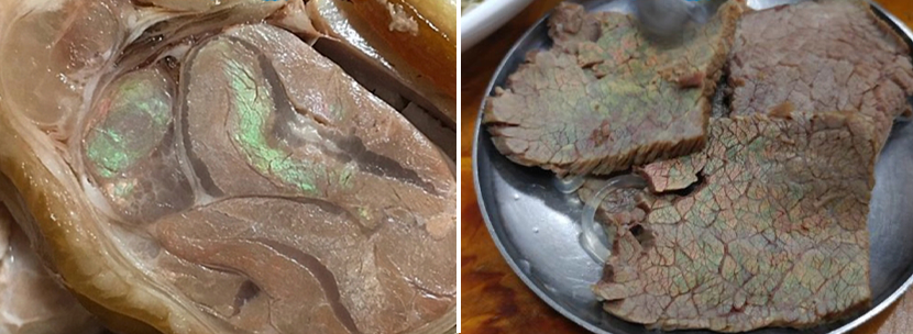 특히 얇게 썬 고기 표면에서 푸른빛, 보라빛, 초록빛이 살짝 도는 건 이런 화학적 성질 때문이에요.
