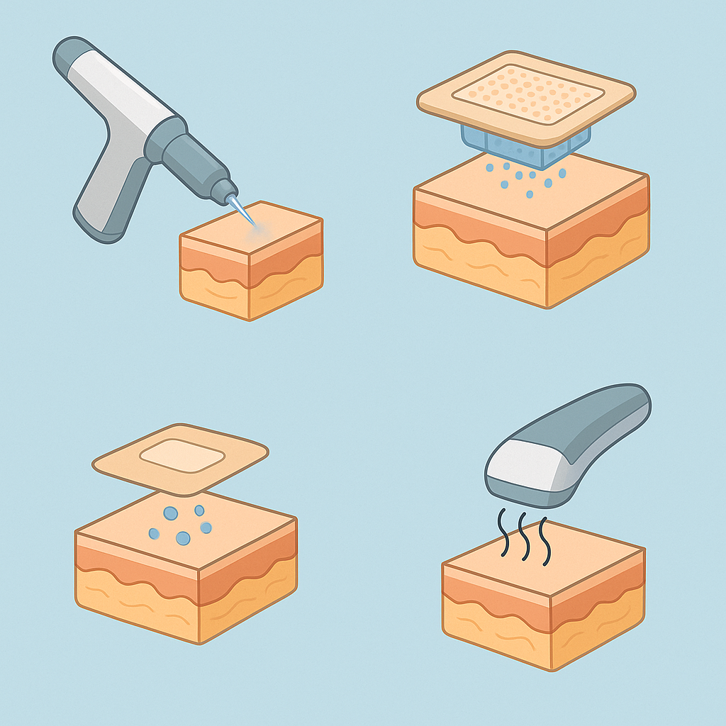 - 원리: 약물을 초고속으로 분사해 피부와 근육 조직을 통과시킴