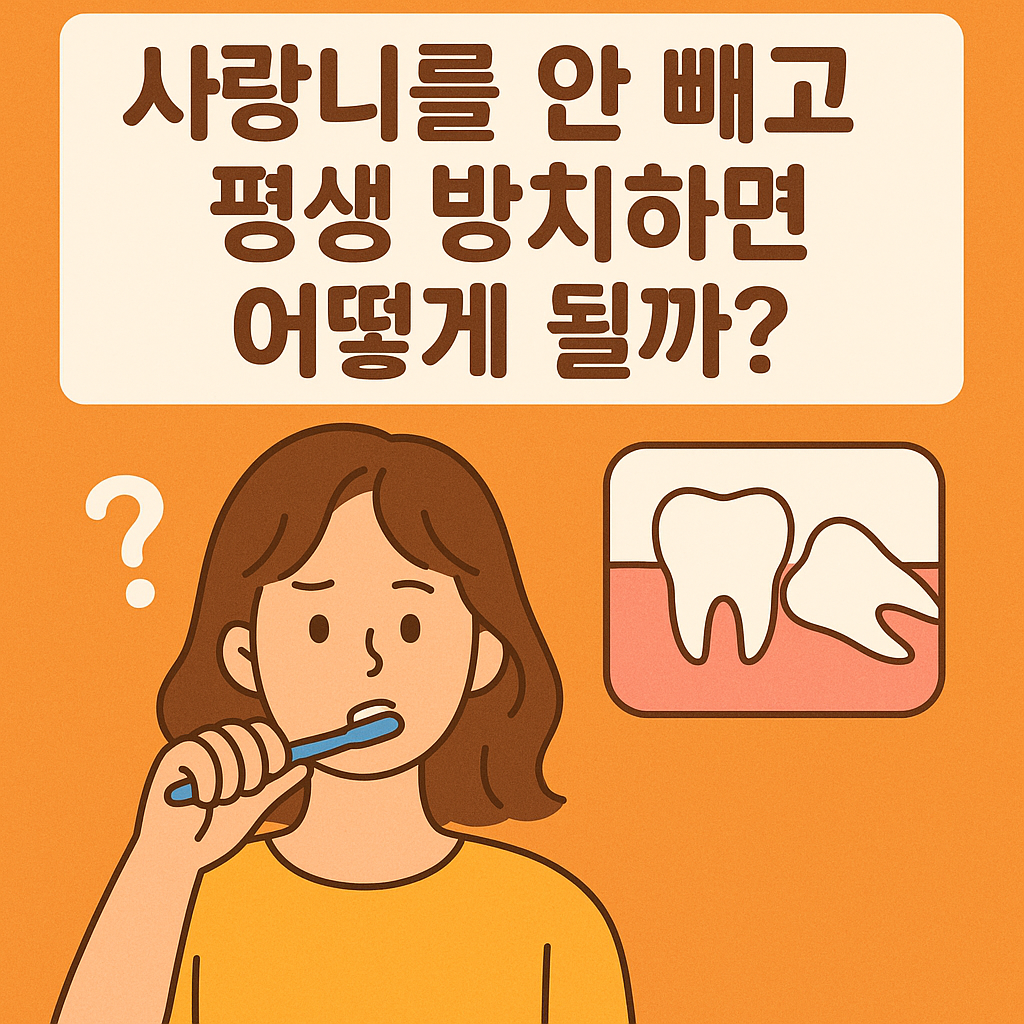 사랑니를 안 빼고 평생 방치하면 어떻게 될까?목차1. 들어가며2. 사랑니는 왜 문제일까?3. 사랑니를 방치하면 생길 수 있는 문제들 3-1. 충치와 앞 어금니 손상 3-2. 잇몸 염증, 스케일링으로 충분할까? 3-3. 치아 배열 변화 3-4. 턱 통증·두통·신경 압박 3-5. 낭종·종양 가능성 3-6. 통증이 없으면 안 뽑아도 될까?4. 그럼에도 불구하고 안 빼도 되는 경우5. 실제 사례에서 배운 교훈6. 마치며1. 들어가며성인이 된 뒤 지금까지 주변 사람들에게 가장 자주 듣는 질문 중 하나가 있어요.바로 "사랑니를 꼭 뽑아야 할까?"라는 건데요.(제 경우는 사랑니가 있지만 특별히 통증이나 불편함이 없어서 그냥 두고 지내고 있답니다..)이 글에서는 사랑니를 안 뽑고 평생 방치했을 때 어떤 일이..